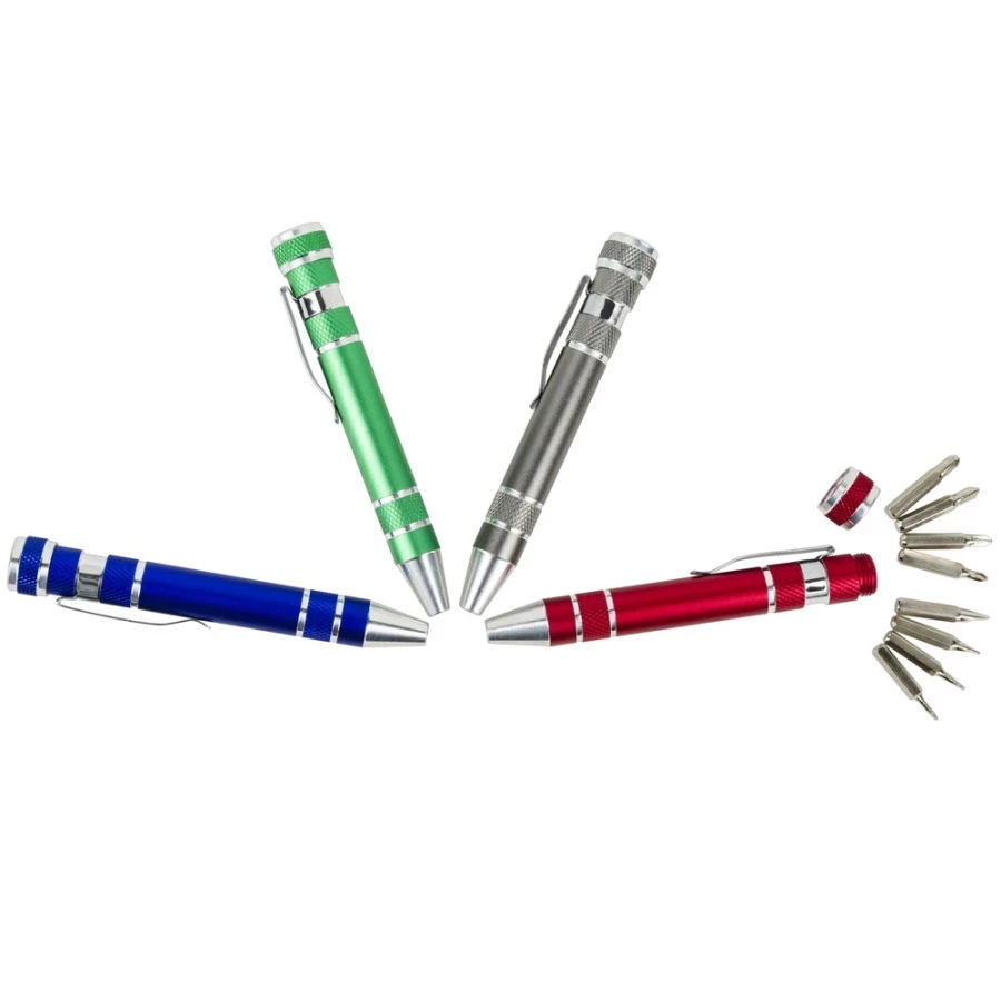Șurubelnița Tate este un gadget mic, dar multifuncțional, pe care nu numai cei pasionați de bricolaj îl vor iubi. Sub forma unui "stilou" elegant, acest ajutor inteligent ascunde până la opt biți interschimbabili - patru plat și patru Phillips - facilitând efectuarea de mici reparații în casă, la birou sau în atelier. Fabricat din aluminiu durabil, este ușor, la îndemână și arată foarte profesionist. Perfect ca un cadou promoțional practic care nu va ajunge într-un sertar, ci în... utilizarea zilnică. Cu logo-ul companiei dvs. pe carcasă, aceasta devine un suport de brand funcțional - ideal pentru târguri, evenimente promoționale sau ca cadou pentru clienți.